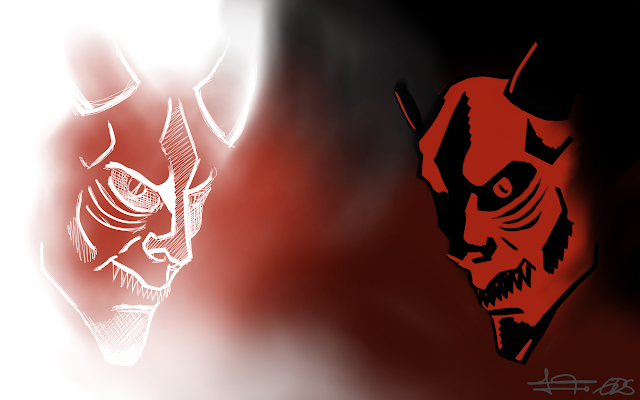 Bon nous ne sommes pas ici pour parler démonologie, théologie ou encore occultisme. Voici un dessin représentant un même diable vu des deux côtés de la barrière. La vision qu'on a d'un côté ou de l'autre est différente pour chacun, mais ça ne change rien au sujet observé... C'est ce que j'ai voulu faire comprendre ici.
